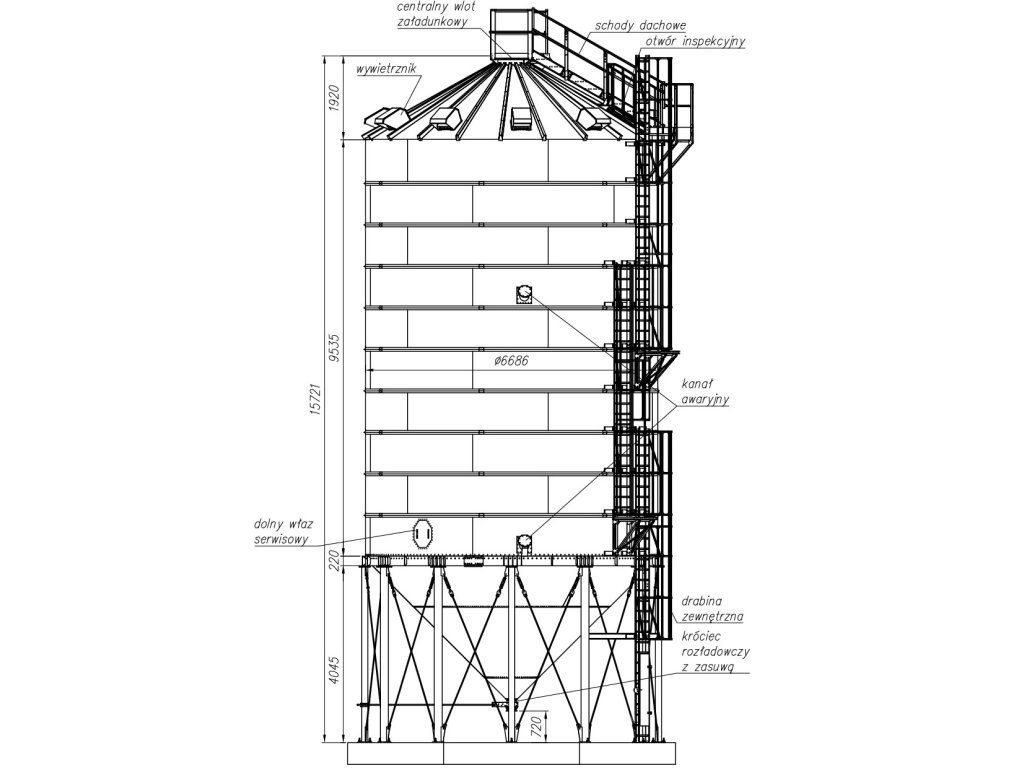 - centrální vpád do sila o průměru 200 mm umístěný ve střeše sila