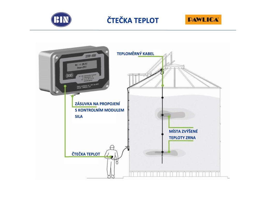 Teplota zrna uskladněného v sile je jedním z nejdůležitějších parametrů bezpečného a kvalitního skladování. Pro zvýšení bezpečnosti skladování obilí v sile je dodáván vícebodový teploměrný kabel, který měří teplotu obilí v celém silu.